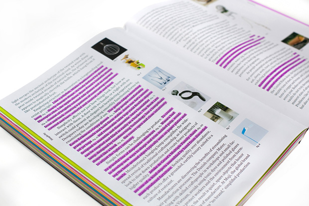 The catalogue is color coded by theme with a vibrant wash of background color, yielding a book that expresses the structure of the content and brings heightened energy and urgency to the page.